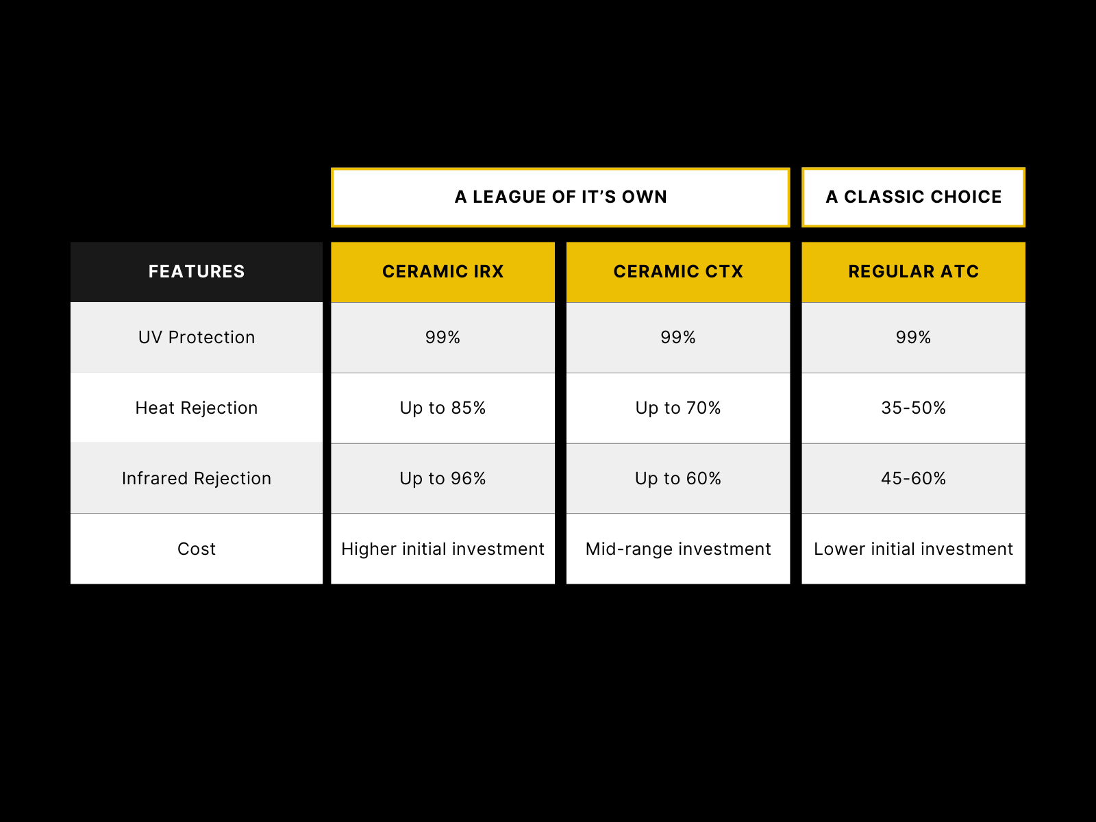 CERAMIC Tint: We offer two ceramic options: IRX and CTX, which provide unmatched heat rejection and UV protection.